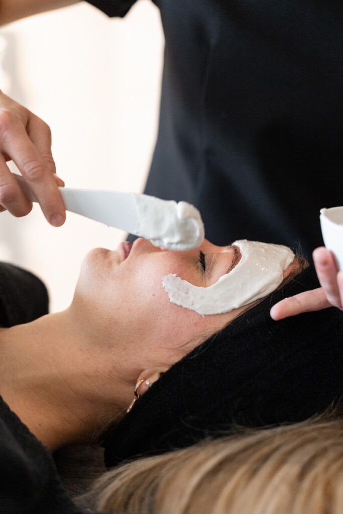 We brengen een vitamine C Glow masker aan. Deze werkt verhelderend, vermindert fijne lijntjes en is een echte oppepper voor je huid.